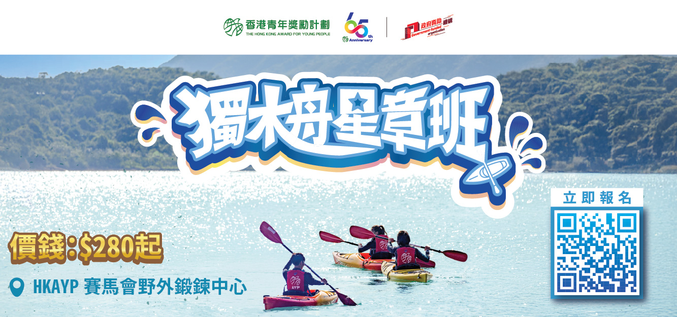 AYP將於今年4月在香港青年獎勵計劃賽馬會野外鍛鍊中心舉辦「獨木舟星章訓練班」。課程由基礎至進階循序漸進,讓學員逐步掌握獨木舟技術。無論你想與親朋好友同樂,還是想學習新技能,本課程都能讓你盡情享受水上活動的樂趣!
