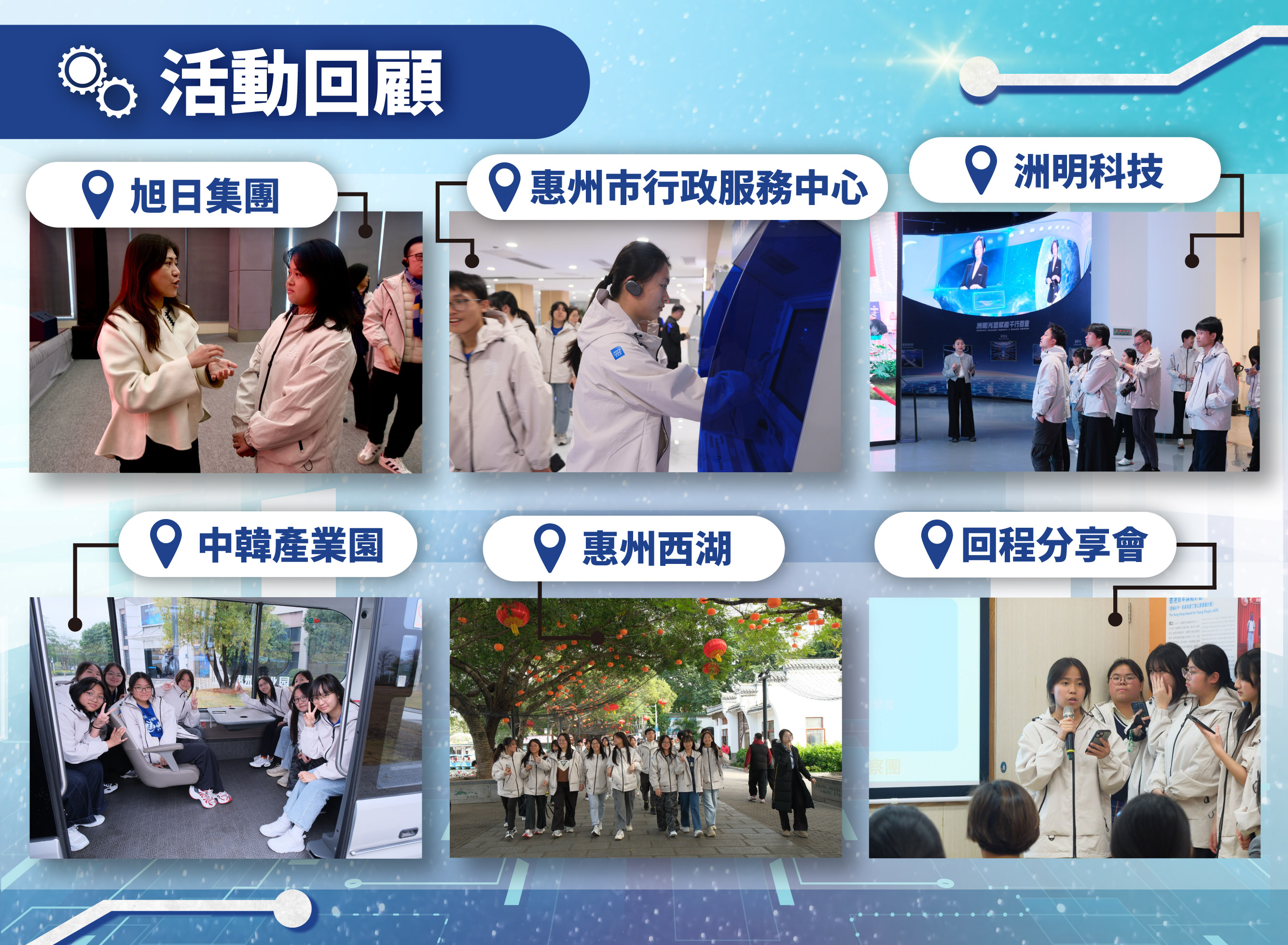 為期兩日一夜的交流活動中,50位參加者先後參訪多家內地知名大型企業,包括洲明科技、中韓(惠州)產業園及旭日集團(中國惠州總部),並考察惠州市行政服務中心和廣東省東江流域管理局。活動亦安排參加者遊覽當地特色景點,深入了解惠州在工業發展及創新科技經濟方面的優勢與成功經驗,進一步掌握內地產業的最新發展趨勢。